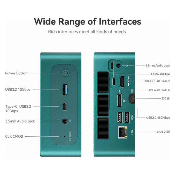 - Beelink Mini PC has a 2.5Gbps Ethernet LAN (RJ-45, Network interface speed up to 2.5Gbps bandwidth rate), 2.4Gbps WiFi6(802.11ax, stronger capacity of resisting disturbance), and built-in Bluetooth 5.2, high-speed wireless connection makes you step ahead. And 1*USB3.2 ports(10Gbps), 2*USB2.0 ports, 1*HDMI port, 1*DP port, 2*USB-C port(USB4 40Gbps), 1*USB-C port and 1*Audio Jack (HP&MIC), 1*DC Jack, thus offering the user even greater versatility in use.