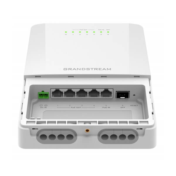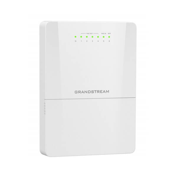 The Grandstream GWN7710R Dubai is a robust 6-port outdoor Lite Managed PoE switch, built to deliver dependable performance in harsh conditions. It comes equipped with five Gigabit RJ45 ports (including four PoE output ports and one PoE input port) and an SFP Fiber Port for extended connectivity. Supporting IEEE 802.3 at/af and 24V/48V DC passive PoE, this switch provides up to 60W power on Port 1 and 30W on Ports 2-4. Its PoE Watchdog feature enhances operational efficiency, while the IP66-rated waterproof and dustproof design ensures durability in extreme temperatures ranging from -40°C to 60°C. The GWN7710R Dubai also includes advanced functionalities such as DHCP Snooping for security, STP/RSTP for network stability and redundancy, and built-in QoS for traffic prioritization. Managing the device is straightforward through options like local web configuration, GWN Manager, or GDMS Networking.